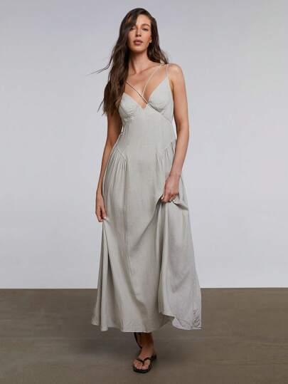 Athîral 女士长款纯色细肩带连衣裙,夏季时尚 - 卡其色 - 查看 1