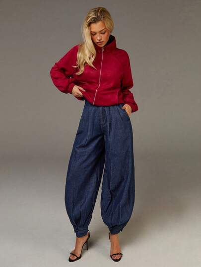Athîral 女士高腰褶裥休闲宽松锥形裤 - 藍色 - 查看 1