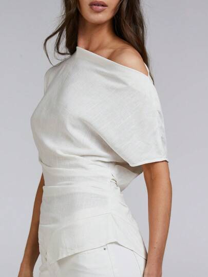 Athîral 女士休闲纯色不对称领垂褶上衣 - 杏色 - 查看 4