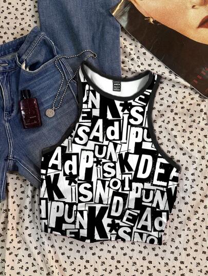 Artist 女士简约休闲全印花英文涂鸦字母图案圆领紧身背心夏季 - 白色 - 查看 1