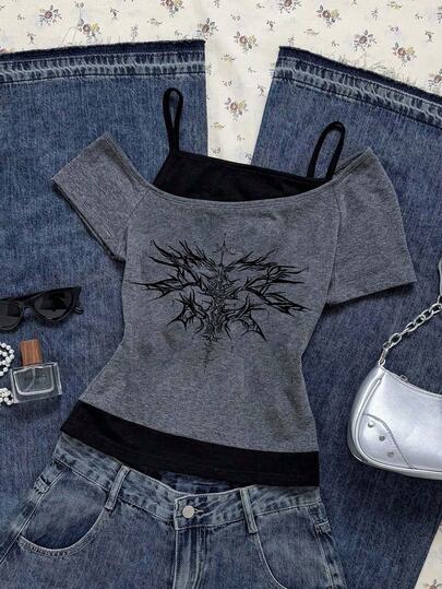 SHEIN Attitoon 女式休闲复古翼印花垃圾朋克图案 Y2K 撞色短袖 T 恤,时尚