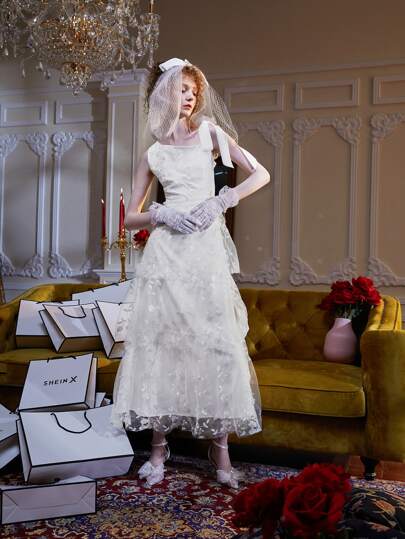 Aurelia Kristie 不對稱領多層下擺刺繡網紗連衣裙 - 米色 - 查看 5