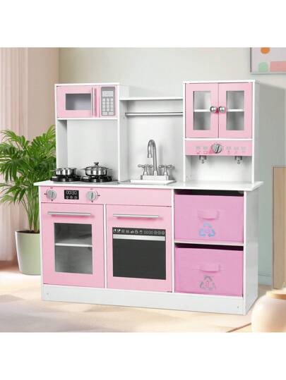 MAMIZO Kids Play Kitchen, Wooden Pretend Toy Kitchen, Toodler Cooking Kitchen Playset With Light & Sound, Sink, Microwave, 2 Fabric Boxs, Dishwasher, Modern Home Style Kitchen Toy For Girls Boys Age 3+ - 粉色 - 查看 1