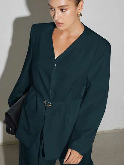 Aveloria Modichic 优雅长袖西装外套搭配直筒阔腿西装裤,办公室穿着