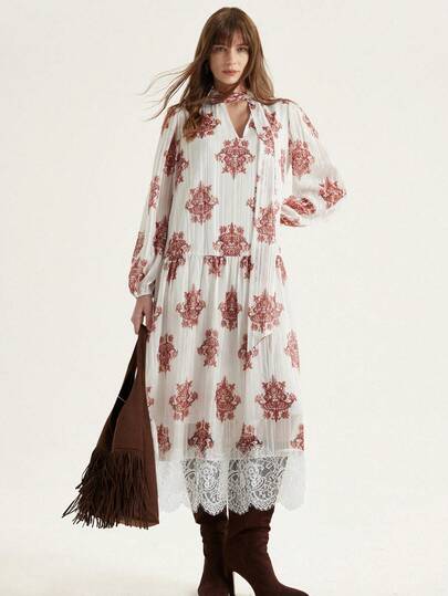 Aveloria Modichic 时尚度假波西米亚风优雅精致闪亮随机印花宽松飘逸下摆拼接蕾丝长袖连衣裙 - 彩色 - 查看 1