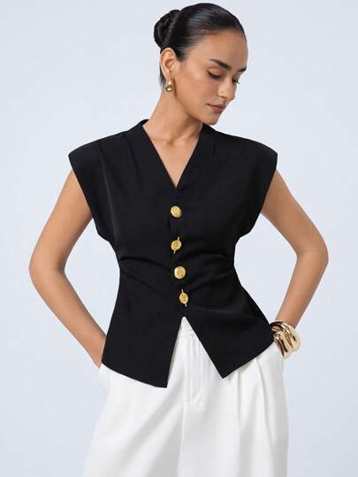 Aveloria Modichic 新款时尚高端收腰V领盖袖背心,优雅开叉不对称金属纽扣百搭通勤衬衫 - 黑色 - 查看 1