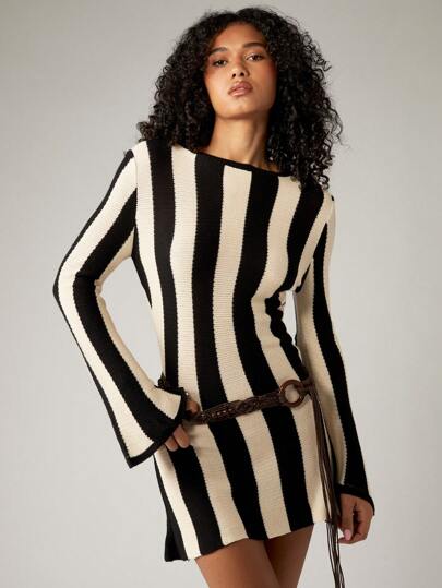 AiiRZ 条纹针织迷你连衣裙长款喇叭袖秋冬紧身毛衣连衣裙复古时尚个性连衣裙派对节日俱乐部之夜 - 彩色 - 查看 1