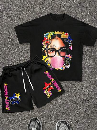 BRAVE ENOUGH Letter And Street Style Graphic Printed Round Neck Short Sleeved T-Shirt With Drawstring Shorts Breathable Summer Casual Set