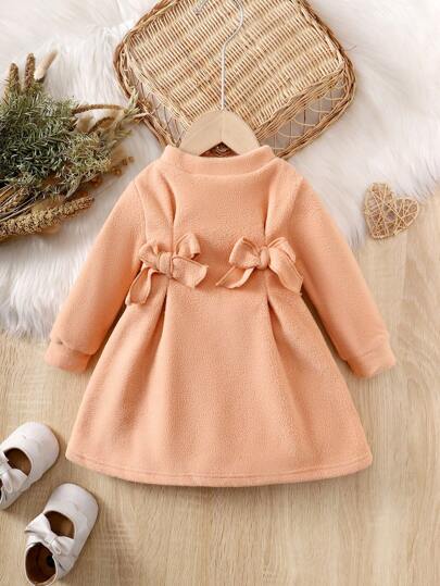 嬰兒前蝴蝶結小高領後鎖孔連衣裙 - 珊瑚粉 - 查看 1