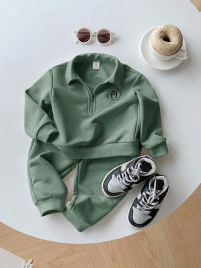 SHEIN Leap Crew 男婴 2 件套字母图案领长袖半襟套头衫和裤子,秋装 - 綠色 - 查看 1