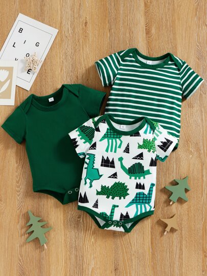 男嬰3入組條紋圖案和卡通恐龍連體衣 - 彩色 - 查看 1