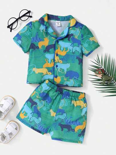 SHEIN 嬰兒男童卡通動物圖案翻領鈕扣襯衫和休閒短褲套裝 - 彩色 - 查看 1