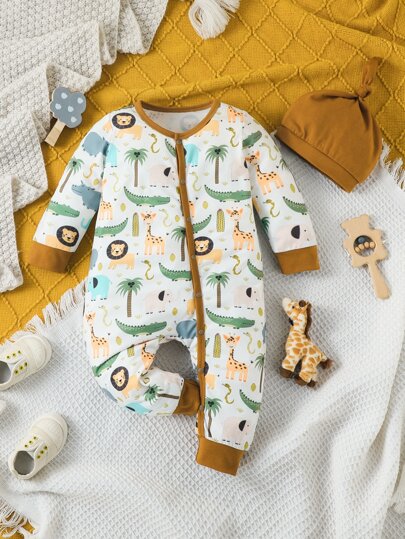 男嬰卡通圖案撞色滾邊連身褲 - 白色 - 查看 1