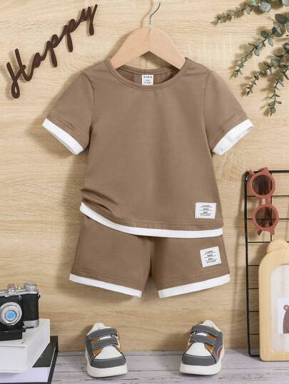 SHEIN Leap Crew 男嬰字母補丁細節拼接邊T恤和短褲 - 杏色 - 查看 1