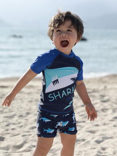 男嬰鯊魚和字母圖案高領沙灘泳裝 - 藏蓝色 - 查看 8