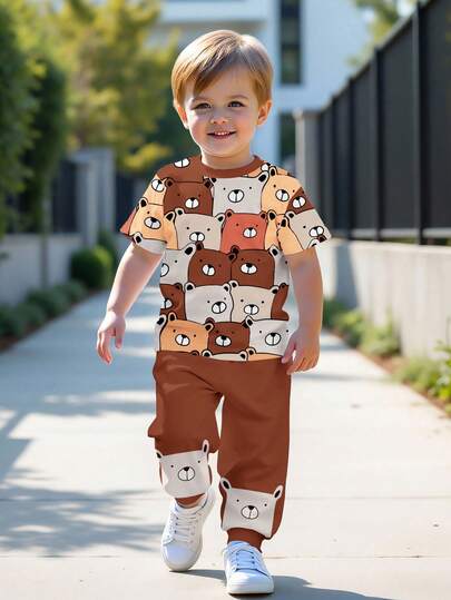 男婴休闲简约圆领短袖上衣和裤子套装,经典酷炫可爱卡通熊图案印花