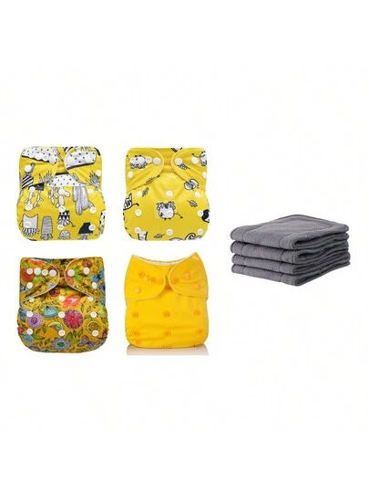 嬰兒布尿布一碼可調節洗用可重複使用口袋式尿布適用於男女寶寶4件套尿布+4根竹炭布插片中性黃色件裝 - 黑色 - 查看 1
