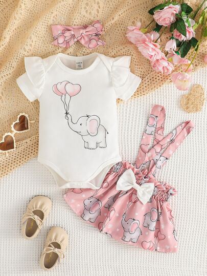 嬰兒大象印花荷葉邊連體衣和前蝴蝶結背带半身裙和頭巾 - 彩色 - 查看 1