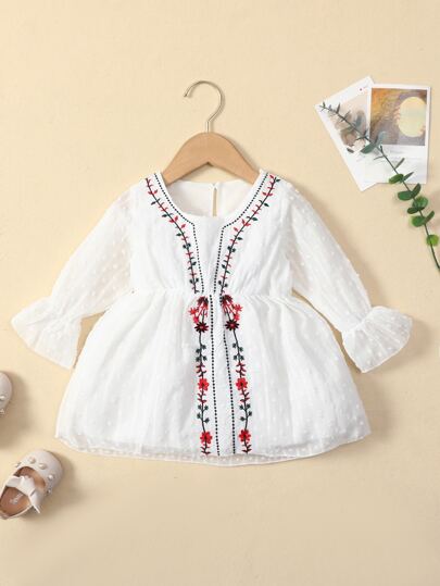 嬰兒花卉刺繡圓點荷葉袖連衣裙 - 白色 - 查看 1