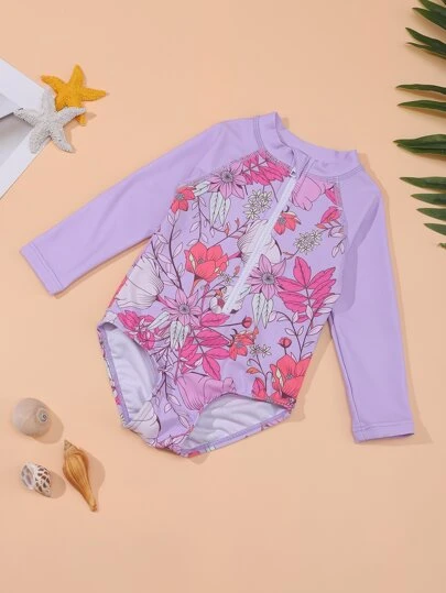 嬰兒印花前拉鍊插肩袖連體泳衣 - 粉色 - 查看 1