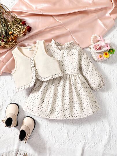 嬰兒褶邊夾克背心和碎花燈籠袖連衣裙 - 杏色 - 查看 1