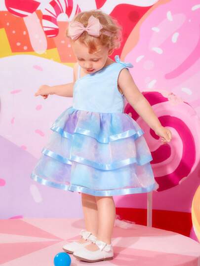 女嬰肩部蝴蝶結網紗覆蓋多層下擺派對禮服 - 藍色 - 查看 1