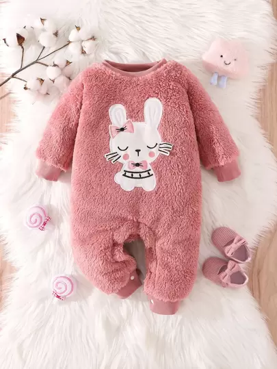 嬰兒女孩漫畫刺繡毛茸茸連身衣 - 粉色 - 查看 1