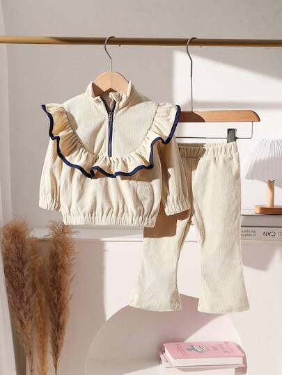 嬰兒女孩休閒彩色拼接荷葉邊上衣和喇叭褲套裝,春季/秋季 - 杏色 - 查看 2
