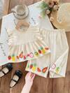 SHEIN 2 件套女婴可爱水果图案荷叶边短款上衣和高腰裤套装,夏季