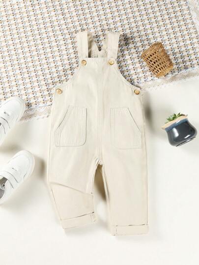 嬰兒女童偏口袋休閒實色牛仔背帶褲 - 米色 - 查看 1