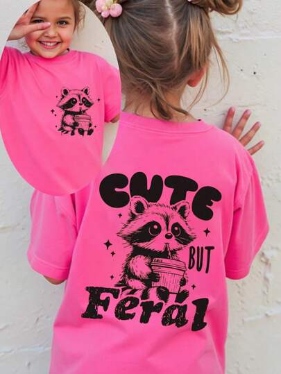 SHEIN 女婴可爱浣熊和奶茶字母“CUTE BUT FERAL”印花短袖 T 恤,春夏 - 玫紅色 - 查看 1