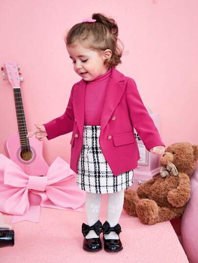 SHEIN 女嬰雙排釦西裝外套&格紋印花半身裙&T恤 - 彩色 - 查看 1