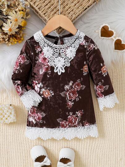 女嬰印花鏤空蕾絲花邊後鎖孔洋裝 - 紅色 - 查看 1