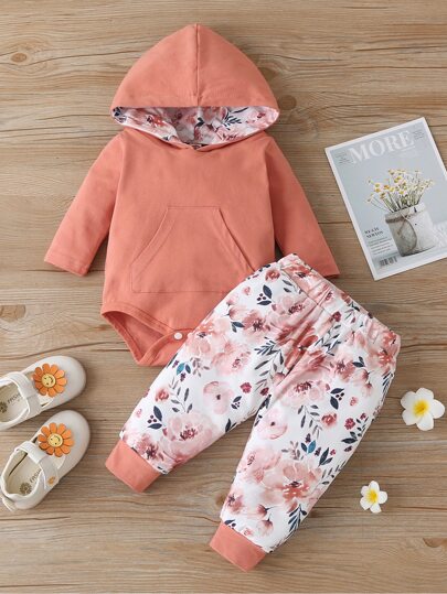 女嬰花卉圖案袋鼠口袋連帽連體衣帶褲子 - 彩色 - 查看 1