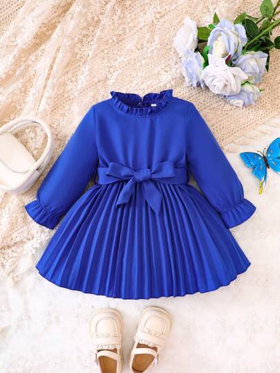 女嬰褶邊荷葉袖百褶下擺繫腰帶連衣裙 - 寶藍色 - 查看 1