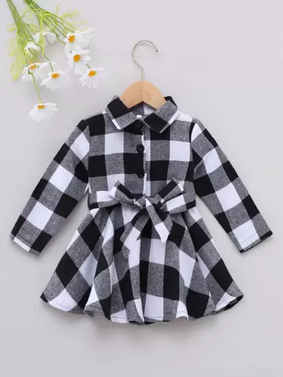 女嬰格紋腰帶襯衫洋裝 - 黑與白 - 查看 1