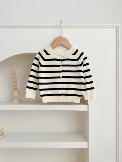 女婴轻便开衫毛衣,经典条纹针织空调夹克,秋季 - 黑與白 - 查看 1