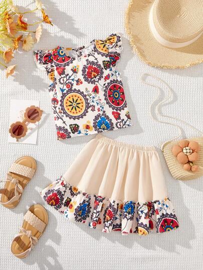 SHEIN 寶寶女孩可愛花卉帽袖上衣和荷葉邊裙子套裝,非常適合夏季度假 - 彩色 - 查看 1