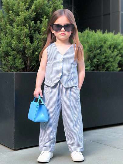女宝宝夏季度假可爱蓝白条纹上衣和松紧腰阔腿裤套装 - 藍色 - 查看 1