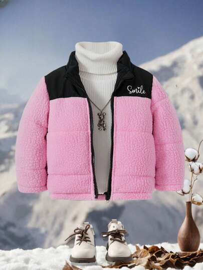女宝宝保暖加绒加厚衬里高领休闲夹克外套户外服装 - 粉色 - 查看 1