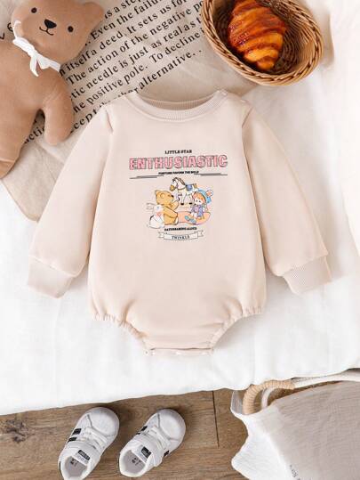女婴圆领长袖针织连体衣,字母、小熊、兔子、小马印花,舒适可爱,休闲百搭,春、秋、冬新款,闪亮小星星设计 - 杏色 - 查看 1