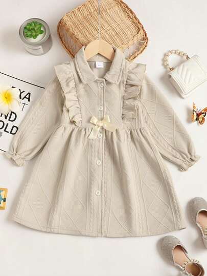 婴儿提花长袖连衣裙 - 卡其色 - 查看 1