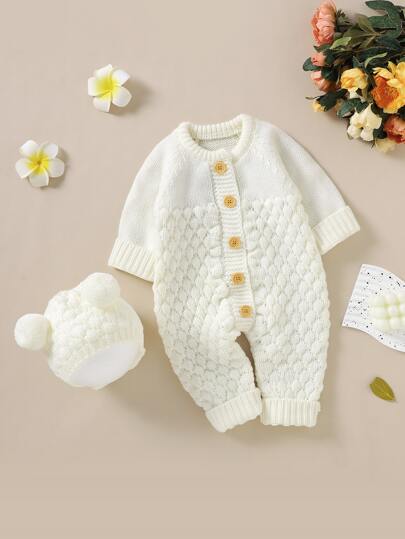 嬰兒插肩袖針織連身褲和帽 - 米色 - 查看 5