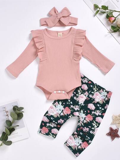 嬰兒荷葉邊連身背心和花卉圖案長褲和頭巾 - 彩色 - 查看 1