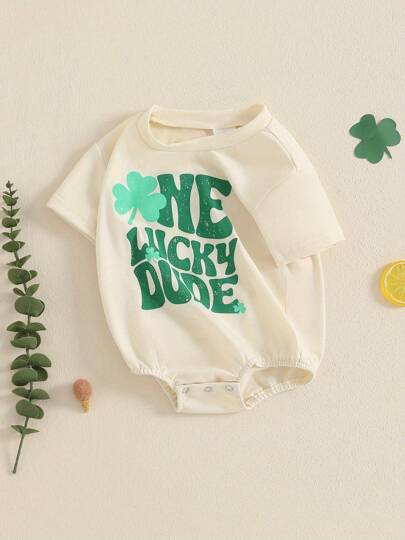Baby Spring Romper Short Sleeve Crewneck Shamrock Letter Print Bodysuit Infant Playsuit - 米色 - 查看 1