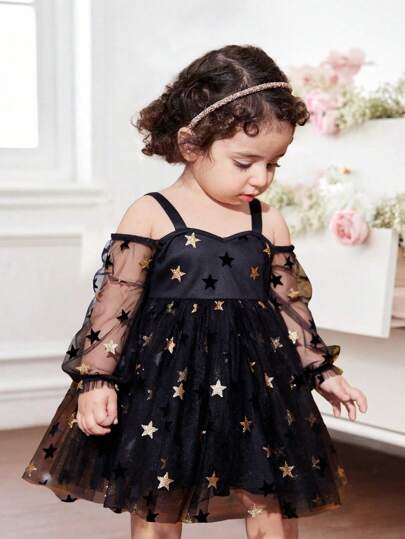 SHEIN Babygirl 圣诞优雅连衣裙,黑色网眼星星装饰无袖和长袖连衣裙,适合派对、聚会、生日 - 黑色 - 查看 1