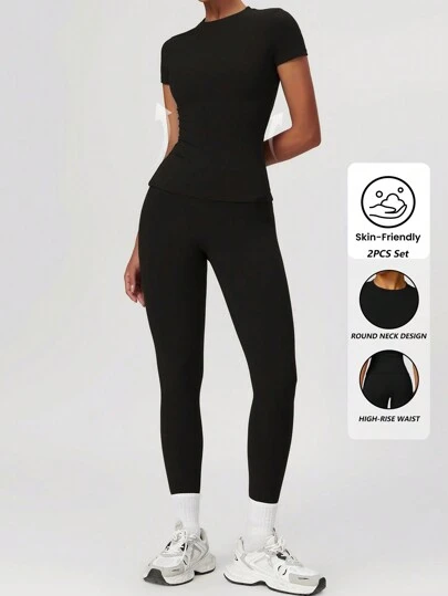 Yefecy 2/4 女式纯色圆领 T 恤和高腰紧身裤运动服套装,运动舒适 T 恤和紧身裤,适合瑜伽健身房锻炼,女士夏季返校运动服,女式运动服,市中心女孩服装春夏风格 - 黑色 - 查看 1
