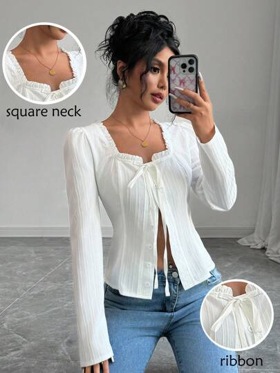 Elenzga 女士纯色荷叶边下摆长袖前系带休闲衬衫 - 白色 - 查看 1