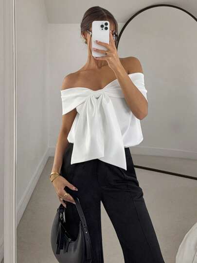 Siren Gaze 女式夏季优雅纯色露肩蝴蝶结装饰衬衫 - 白色 - 查看 1