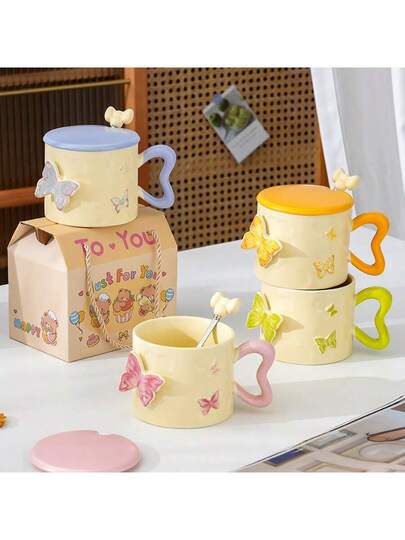 1 件蝴蝶压花带盖马克杯,4 种款式可选,配有不锈钢勺子,适合男孩和女孩的温馨风格礼物 - 黃色 - 查看 4